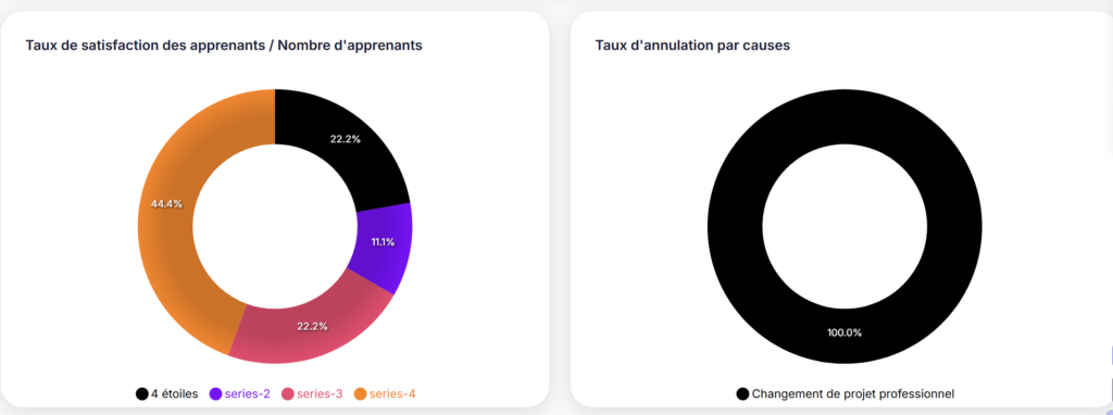 Les tableaux de bord agrègent en temps réel toutes les données collectées, taux de satisfaction, nombre de participants, taux d’abandon, sans aucun calcul manuel. L’analyse de performance permet de filtrer les résultats par formation, par période ou par financement pour présenter des indicateurs segmentés à l’auditeur en quelques clics.