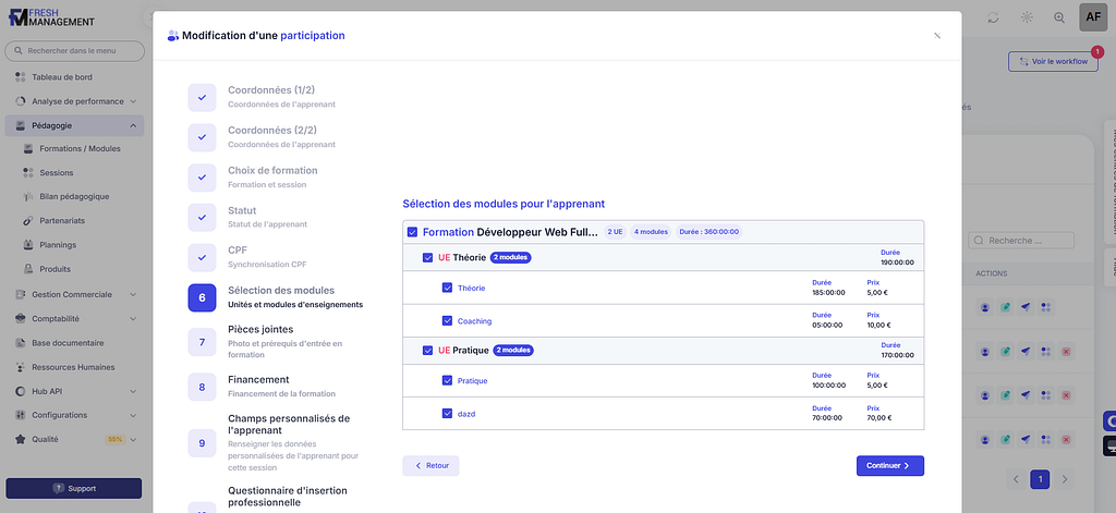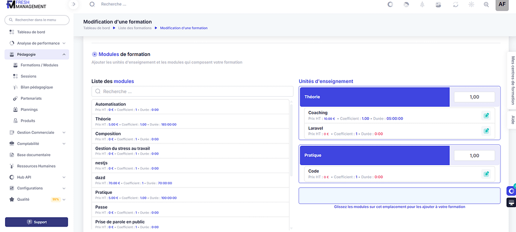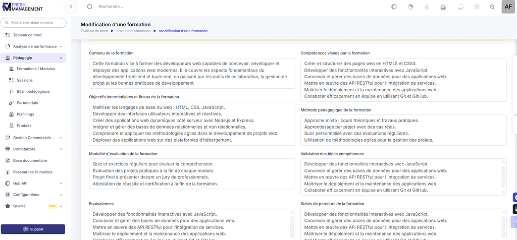 Fresh Management centralise cette cohérence. Les programmes de formation intègrent nativement un bloc dédié aux objectifs opérationnels. Quand vous modifiez un objectif, la mise à jour se propage automatiquement dans tous les documents générés depuis ce programme — convention, livret d’accueil, fiche programme publique.