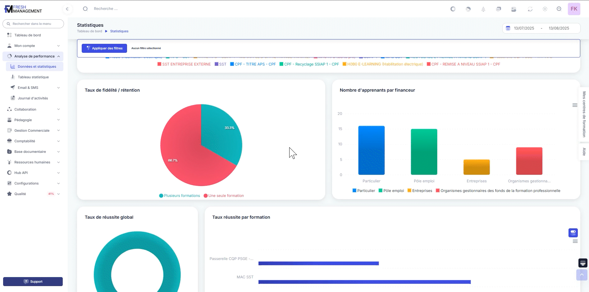 Grâce aux Tableaux de bord de Fresh Management, obtenez une vision globale de l’ensemble de votre centre de formation. Vous pouvez visualiser rapidement les données importantes telles que le nombre d’inscriptions, le taux de participation, les revenus générés, et bien plus encore.